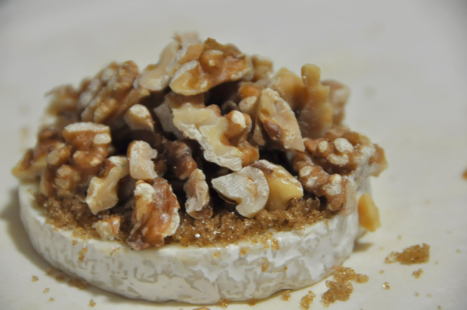 Place Brie cut side up in the middle of the sheet and top with 1/8 cup packed brown sugar and 1/4 cup roasted, chopped walnuts
